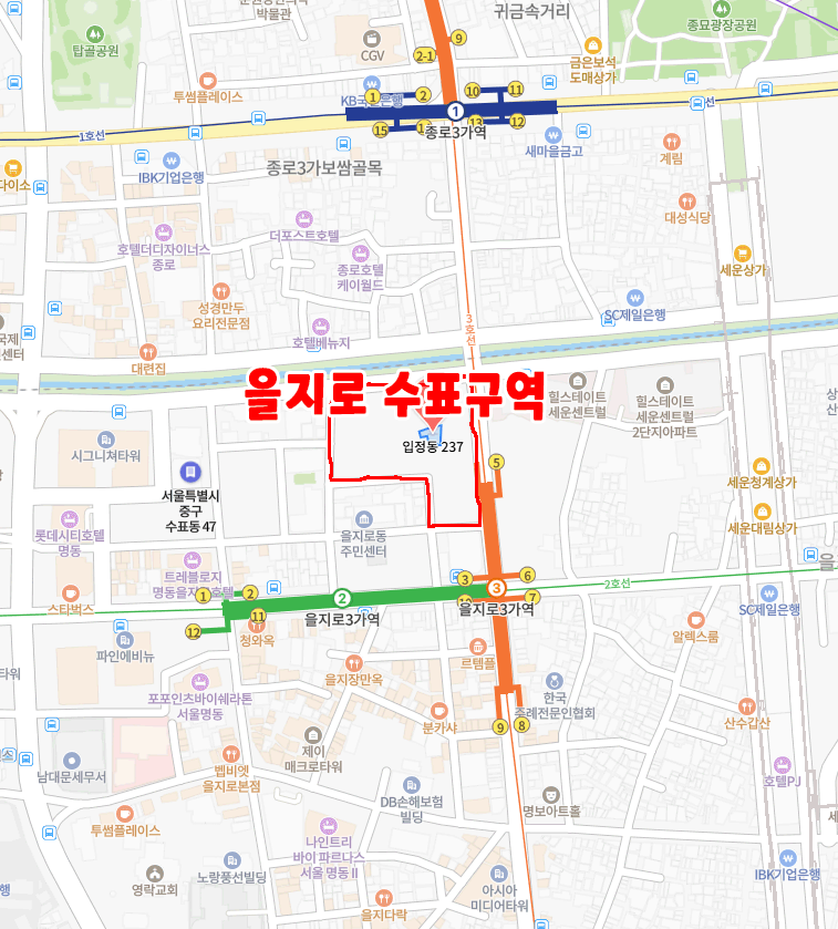 서울 중구 입정동 237번지 일대가 수표구역이구요... 지도에서 보시는 것처럼 지하철 2호선 을지로3가역과 3호선 을지로3가역을 끼고 있습니다.