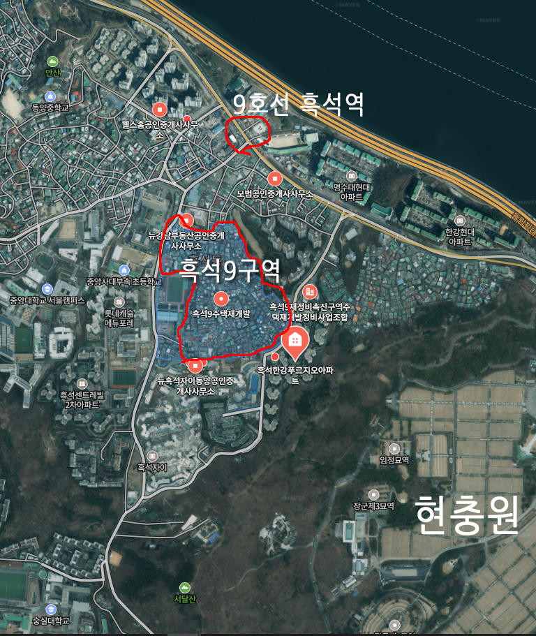 흑석9구역은 한강에서 약간 뒤로 물러나 있습니다